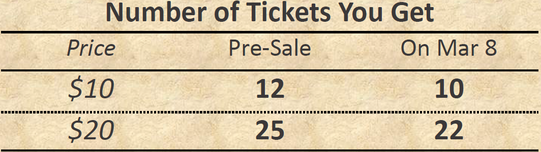 Lunar New Year raffle ticket pre-sale will be held on 2/22 and 3/1. Don’t worry. If you miss the pre-sale, you can still purchase the tickets on 3/8. Below is the price chart. Please note the sale is CASH and CHECK ONLY.